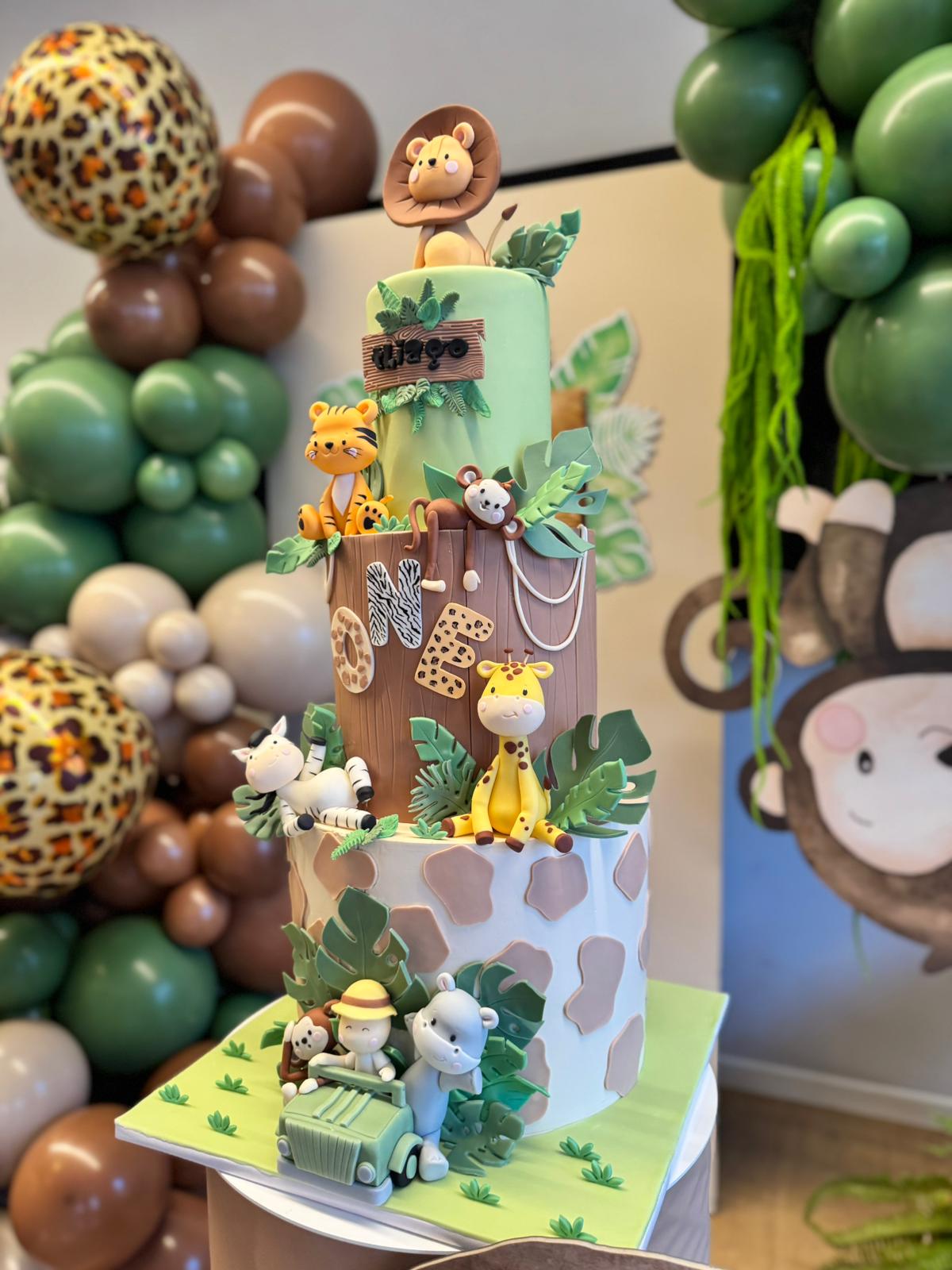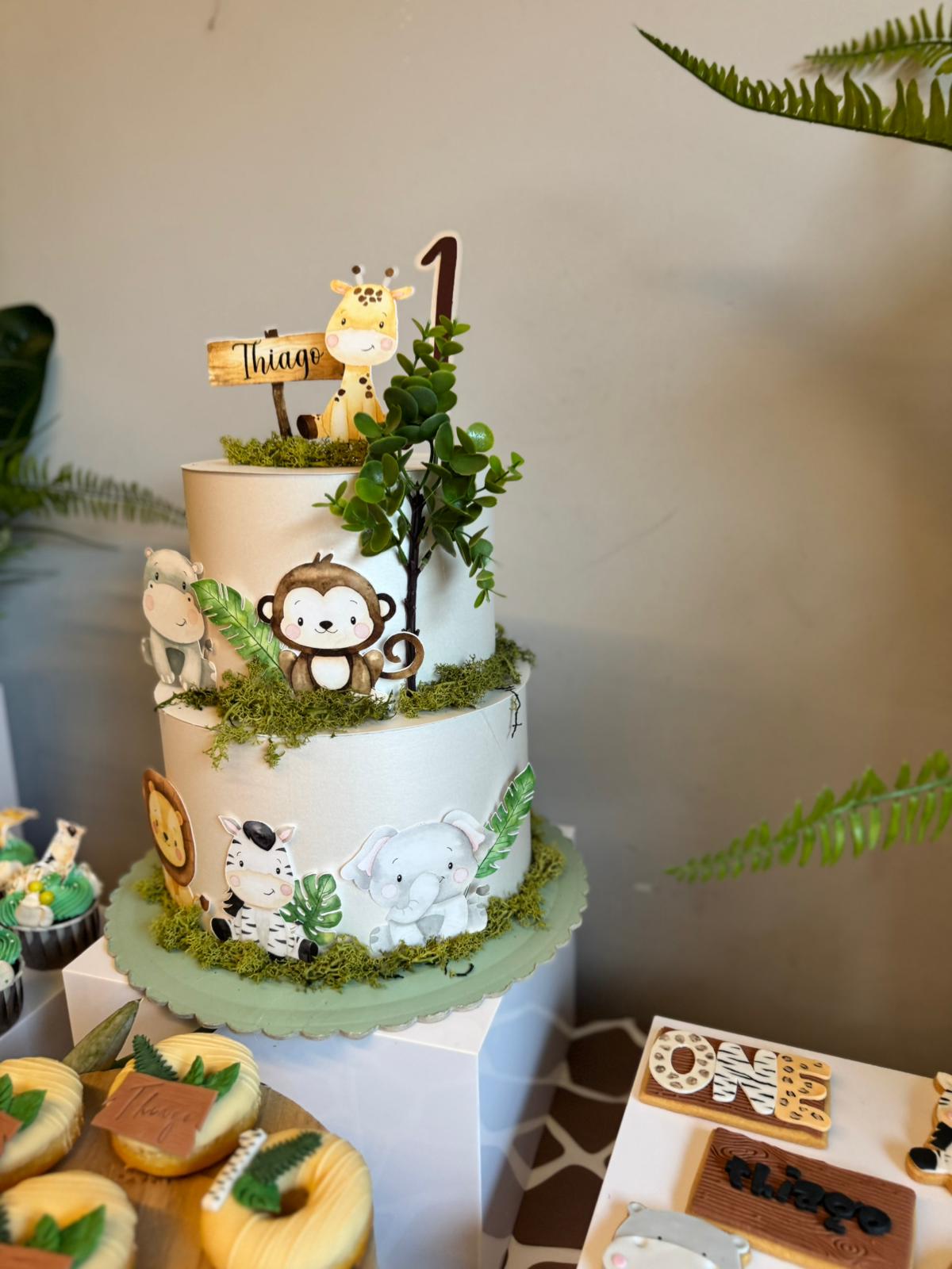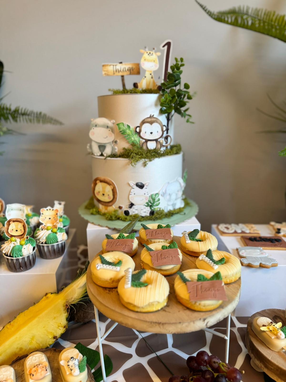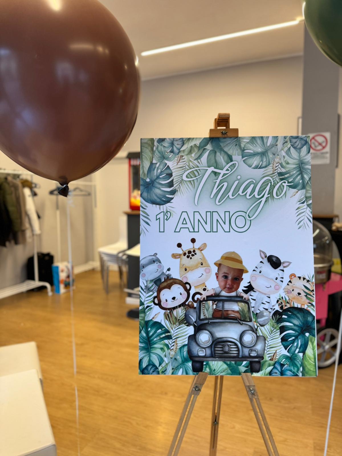 La Scenografia Principale Il cuore del nostro allestimento è stato composto da pannelli personalizzati con grafiche a tema Safari. Abbiamo dato grande risalto al pannello centrale, personalizzandolo su misura con il nome e lo stile dell’evento per renderlo il perfetto sfondo della festa.