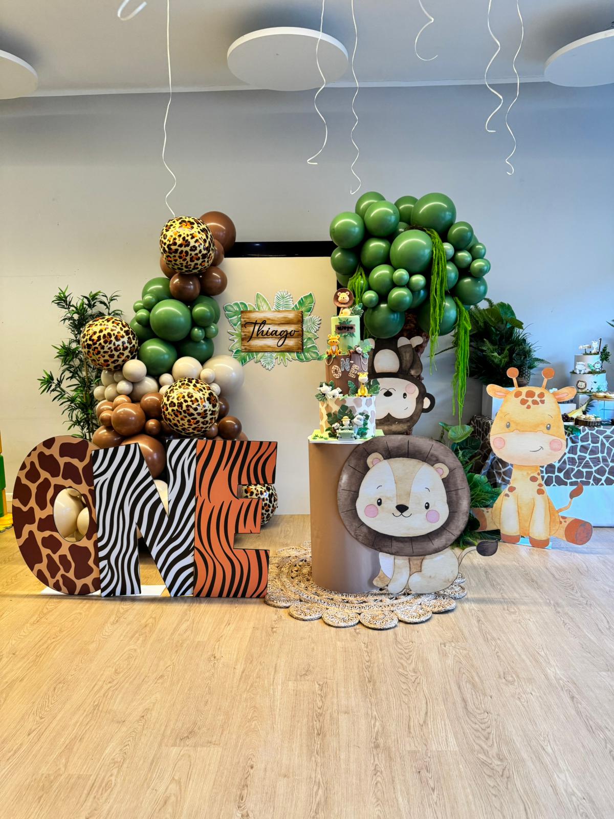 La Scenografia Principale Il cuore del nostro allestimento è stato composto da pannelli personalizzati con grafiche a tema Safari. Abbiamo dato grande risalto al pannello centrale, personalizzandolo su misura con il nome e lo stile dell’evento per renderlo il perfetto sfondo della festa.