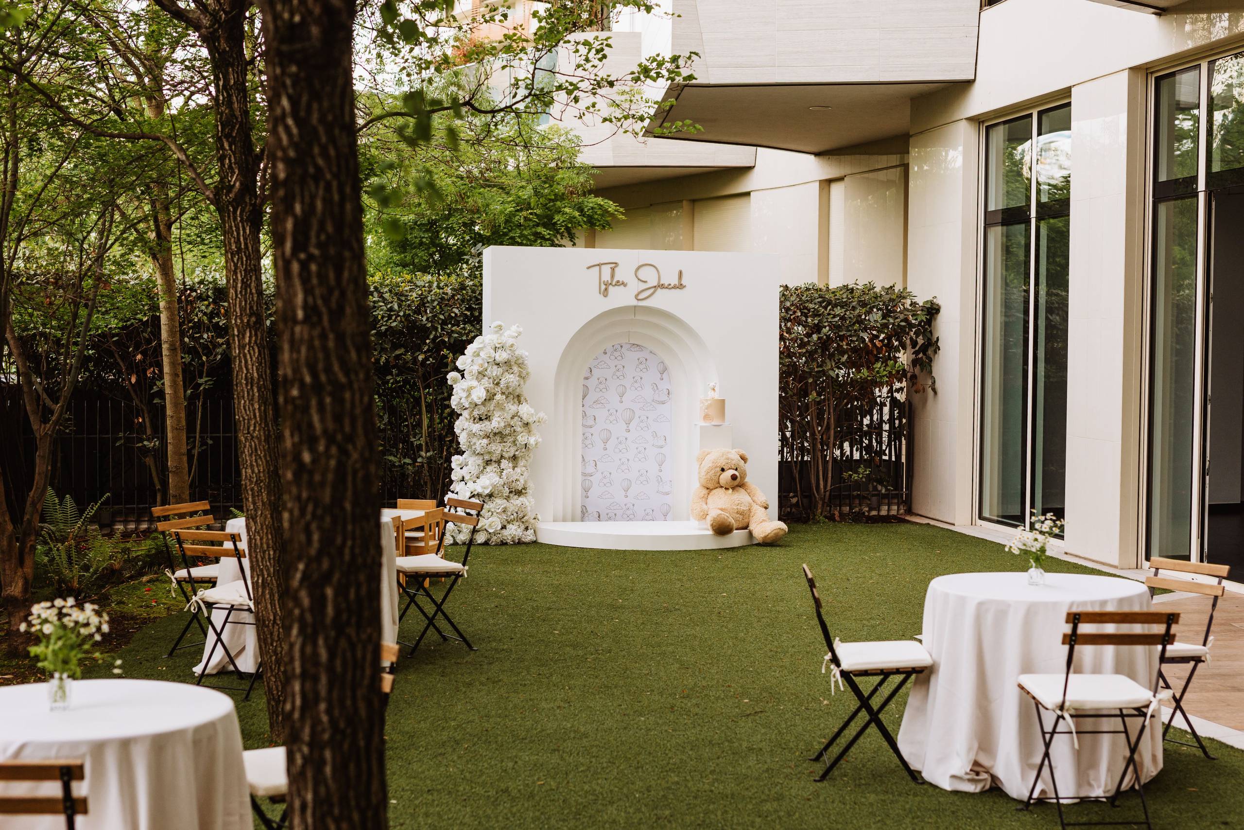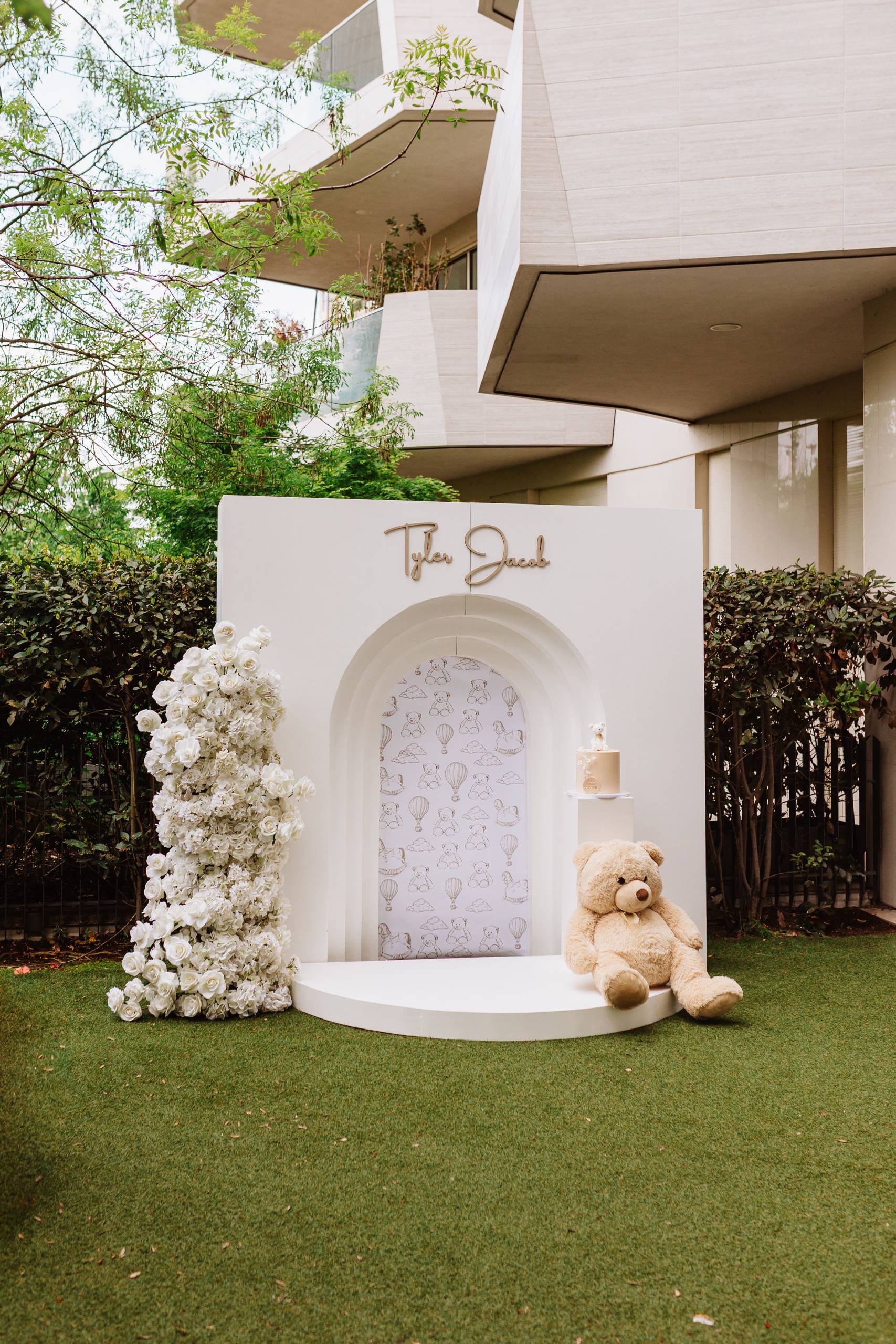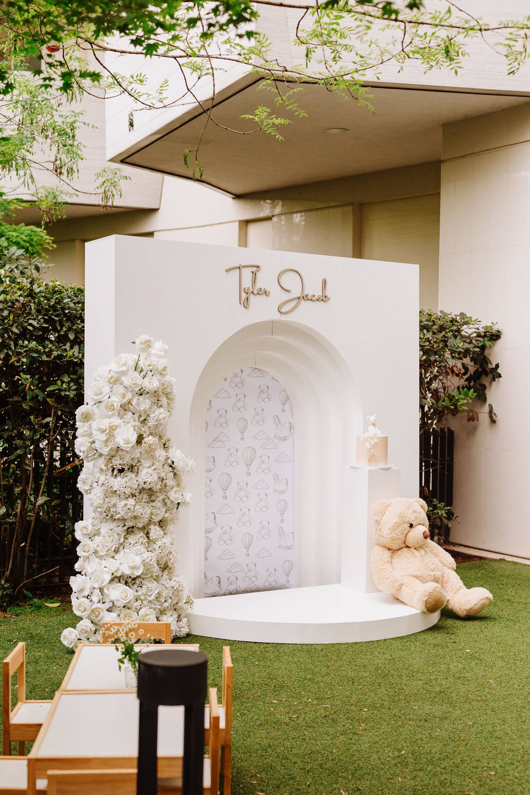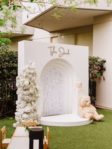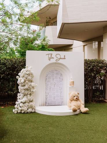 Per il dolcissimo battesimo del piccolo Tyler Jacob, un’Event Planner ci ha affidato la realizzazione di un progetto estremamente raffinato. La richiesta era chiara: dare vita a un allestimento elegante, completamente bianco e dal mood spiccatamente minimalista, arricchito però da un tocco di pura tenerezza attraverso l’inserimento del tema “Teddy”. L’obiettivo finale era ottenere una scenografia visivamente pulita, dal design moderno e perfetta per fare da cornice impeccabile allo shooting fotografico dell’evento.