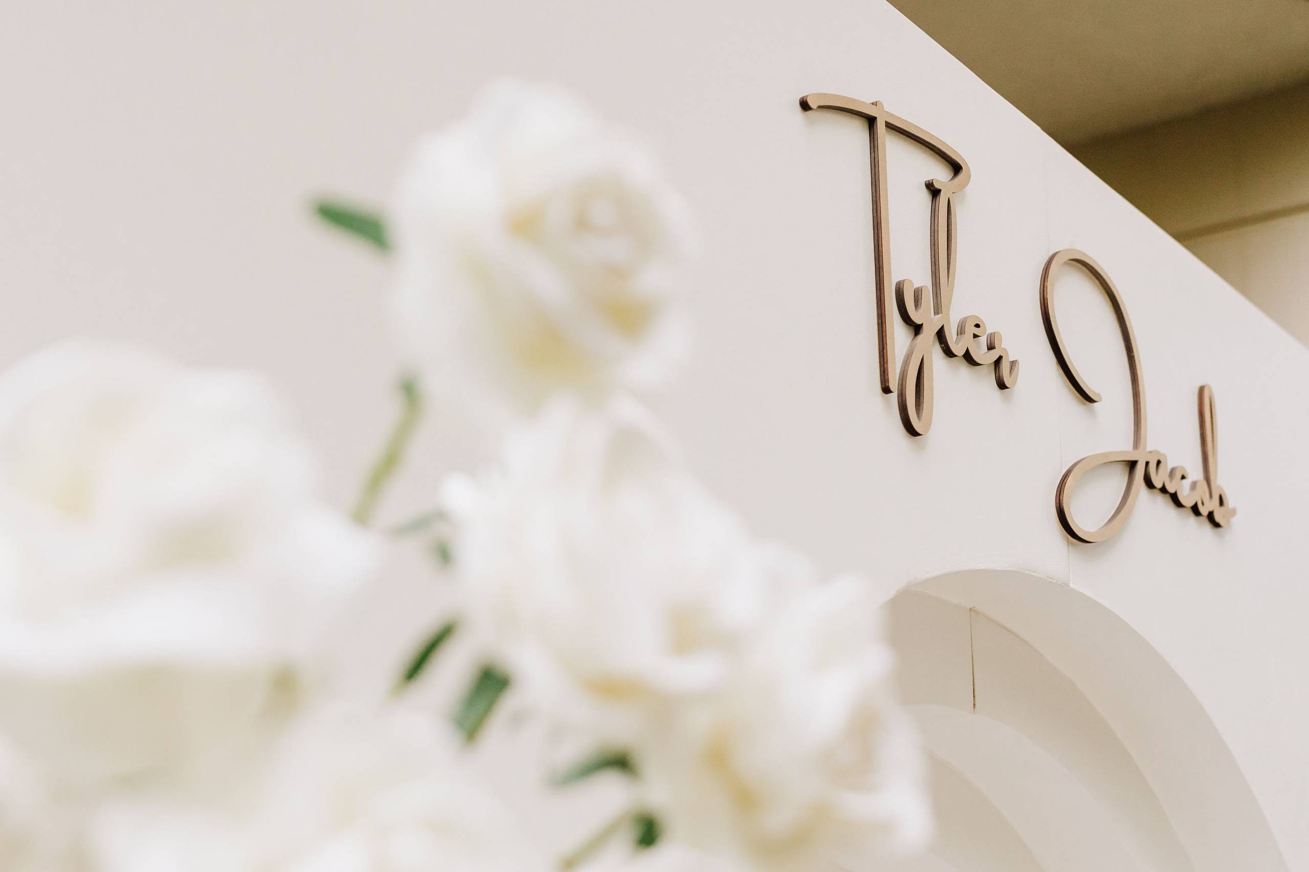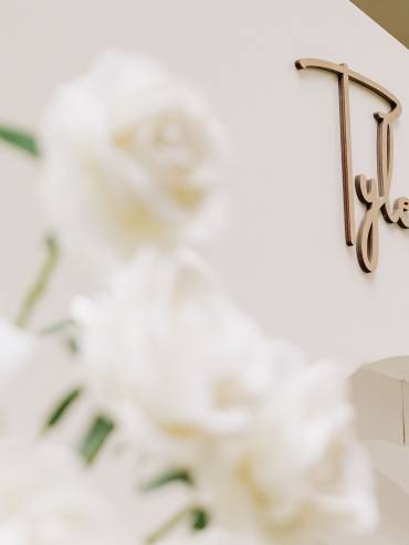 Design Essenziale e Architetture Candide Per esaudire questa visione e rispettare l’estetica minimalista, abbiamo progettato e realizzato un backdrop scenografico bianco sagomato, caratterizzato da un elegante e sinuoso arco a più livelli. Per impreziosire questa struttura candida e luminosa, abbiamo personalizzato il set applicando il nome “Tyler Jacob”, realizzato con un raffinato lettering tridimensionale.